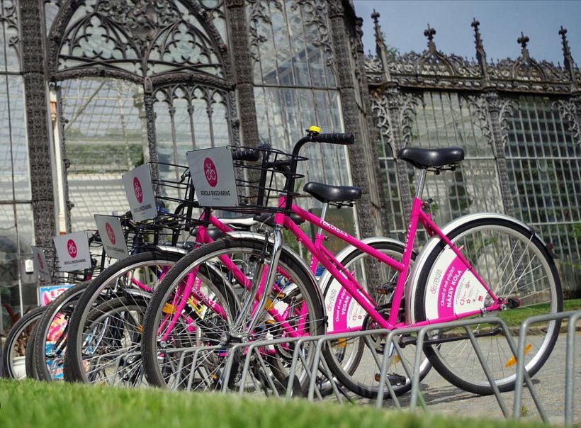 Růžová kola, která odemknete appkou a zase vrátíte kdekoliv v centru Budějc. Vyrazit můžete i na výlet do okolí. www.rekola.cz