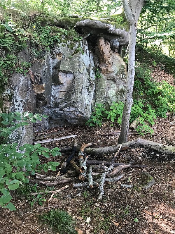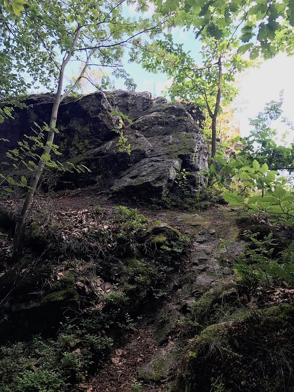 Ve chvíli, kdy správně odbočíte dorazíte k plotu místní obory, podél kterého půjdete po celou dobu. Ve chvíli, kdy dorazíte na vrcholek tohoto kopce, tak zbystřete. Teď musíte najít místo, kde zatočíte vpravo (u velkého památného stromu), projdete kolem převisu (kde bývá občas ohniště, ale rozdělávání ohně nedoporučujeme) a cestička vás povede dolů. Hustějším porostem směrem z kopce se budete blíž k vodě, kdy narazíte na skalní útvar.