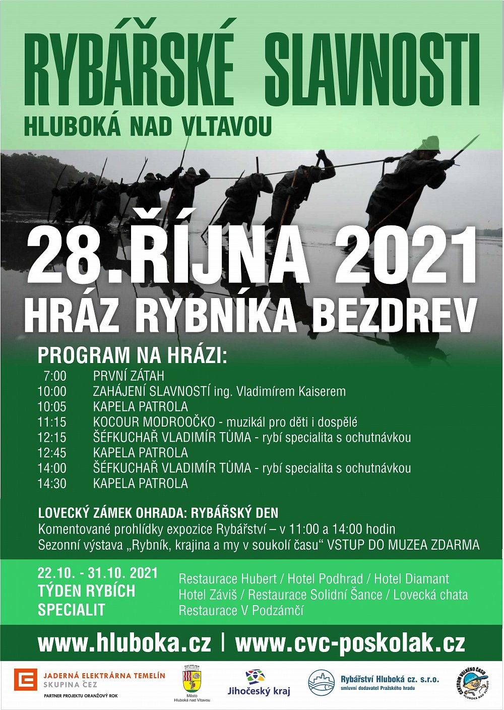 Doprovodný program s ukázkou rybářského a gastronomického umění proběhne taktéž na hrázi rybníka Bezdrev. V hlubockých restauracích bude zároveň probíhat od 22.10. do 31.10. Týden rybích specialit, kdy budete moci vyzkoušet rybí speciality místních šéfkuchařů.