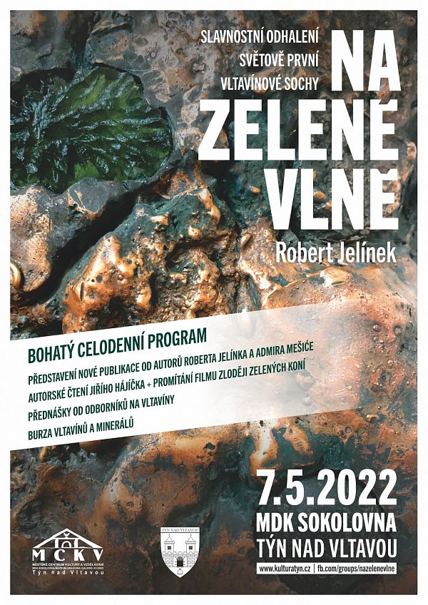Přijměte naše pozvání na akci, která v našem městě nemá obdoby! Čekají nás úžasné přednášky s odborníky na vltavíny, připraveno je také autorské čtení s Jiřím Hájíčkem i projekce filmu Zloději zelených koní. Celému dni pak dominuje slavnostní odhalení vltavínové sochy "Na zelené vlně" a křest stejnojmenné publikace s autory. To vše ve vltavotýnské Sokolovně v sobotu 7. května 2022.